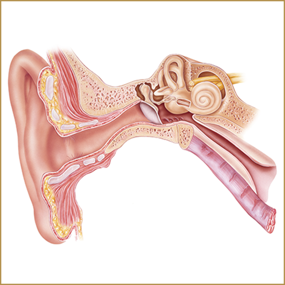 Die Ohrmuschel fängt die Geräusche von außen auf. Durch die spezielle Ohrform werden die Schallwellen wie in einem Trichter zum Trommelfell weitergeleitet.